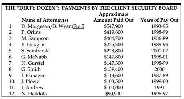 While the Fund is currently in excellent shape with a current balance of well over $2 million dollars, history has shown that one or two attorneys can turn this good news into bad news rather quickly. So which lawyers have been responsible for the most money paid by the Board in its existence? Here, in the Hall of Infamy, is the “Dirty Dozen,” listed in the chart below.